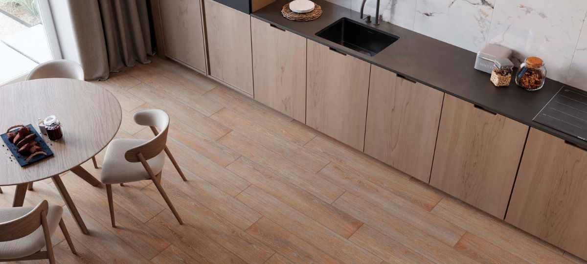 Kraft Wood — необычная коллекция. Некоторые артикулы имитируют наборный паркет двух оттенков. Миксуя их при укладке, вы добьетесь эффекта легкой небрежности, поскольку плашки специально сделаны разной ширины.