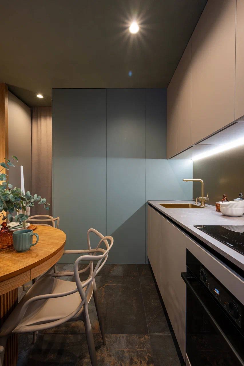 Эффект состаренного металла и деликатные рыжие вкрапления поддерживают цветовую палитру пространства, не споря с ней, а усиливая общий ритм.