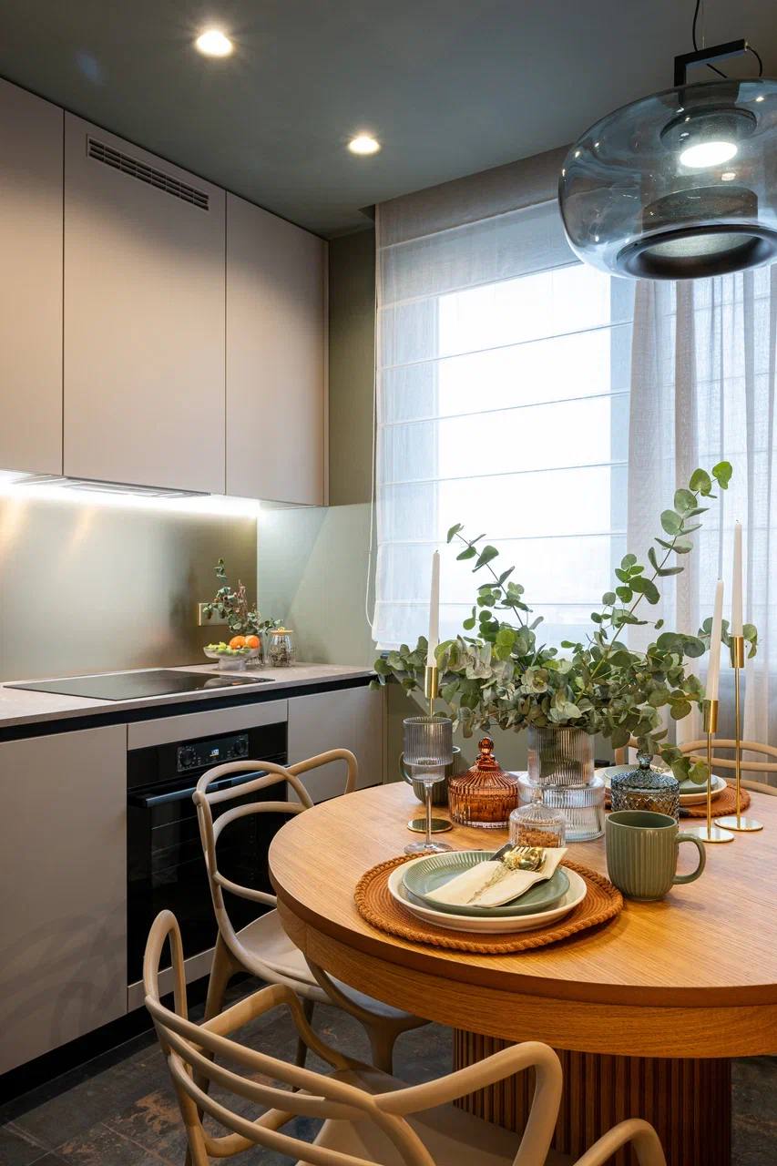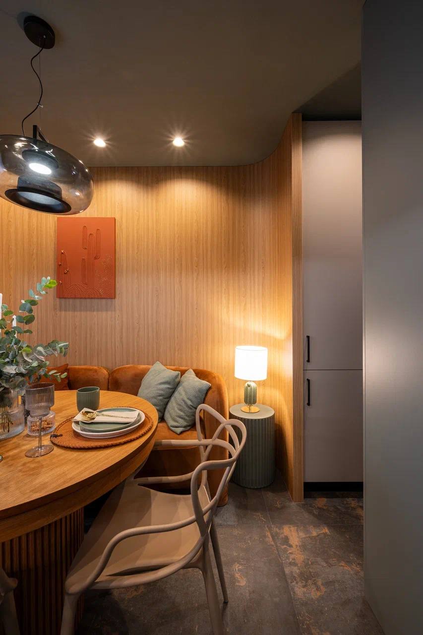 Керамогранит Patina становится ключевым элементом интерьера, где тёплое дерево, округлая мебель и мягкий свет создают уютный фон.