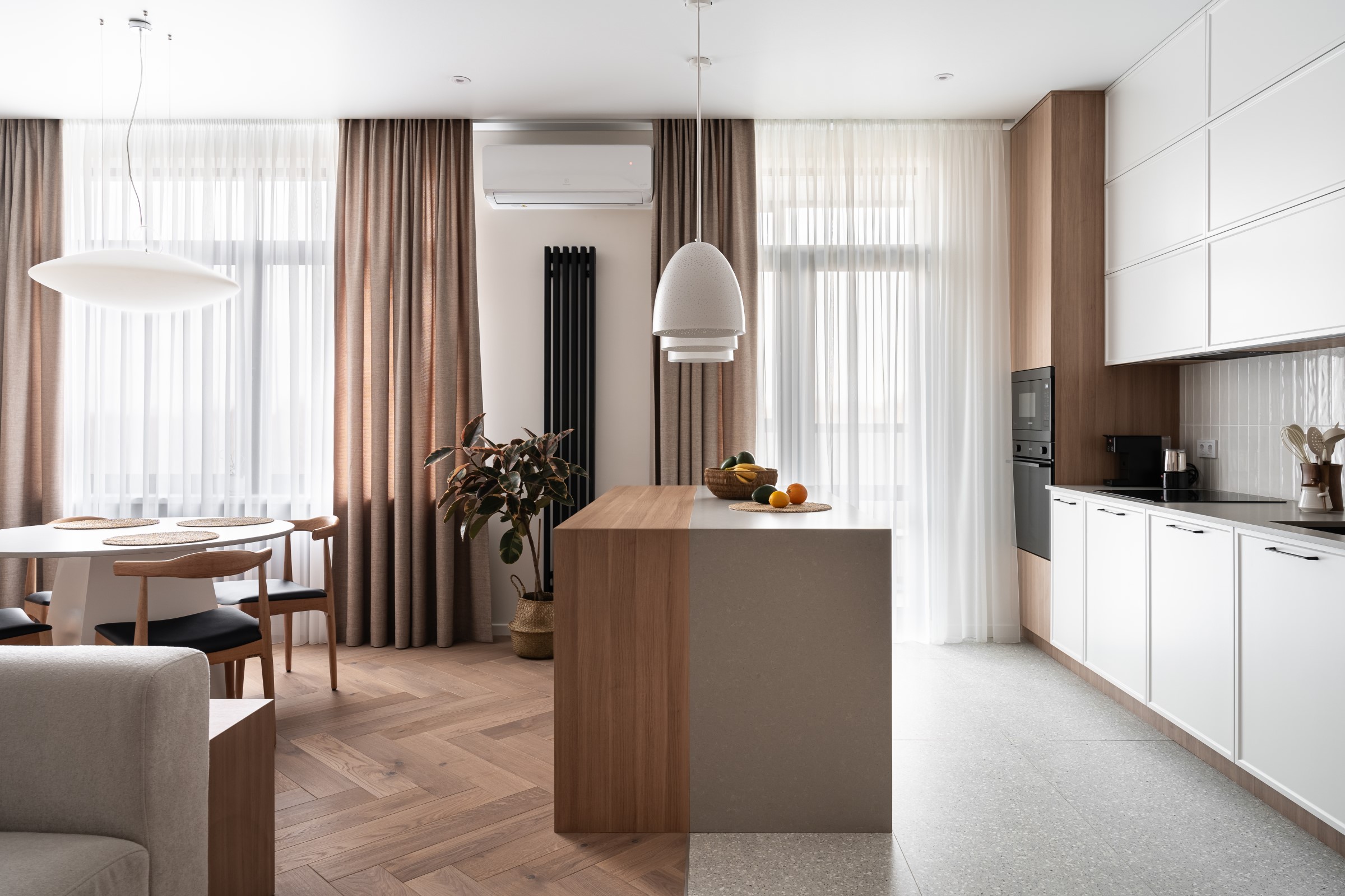 В минской квартире в ЖК Олимпик Парк (112 м²) нет ни одного лишнего акцента — только воздух, свет и фактуры. Классический теплый минимализм.