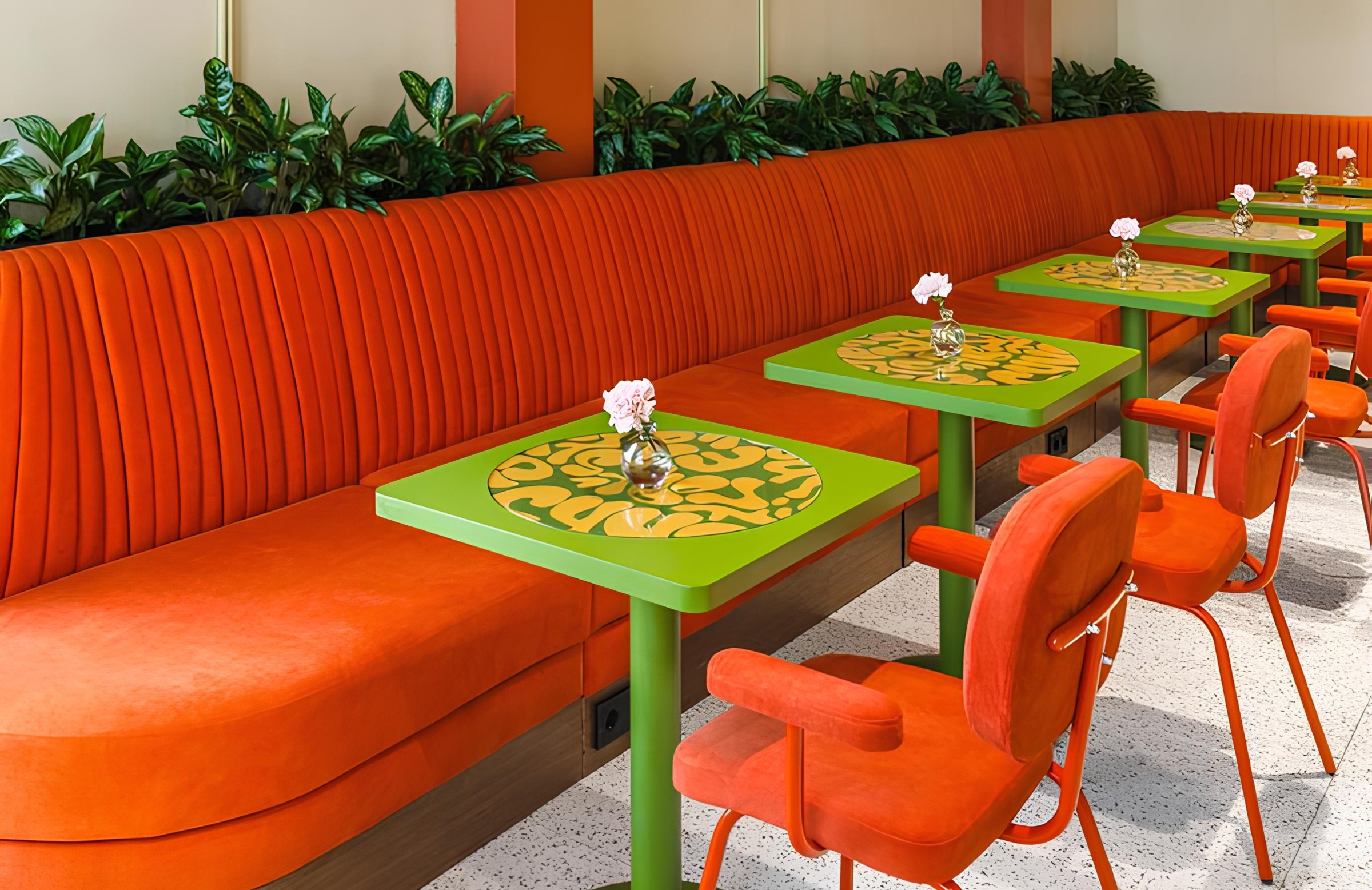 Кафе Roots в Астане — пространство, в котором интерьер работает на эмоции: тёплые оттенки апельсина и лайма, плавные формы и мягкое освещение создают ощущение заботы и комфорта.